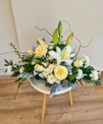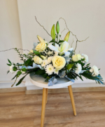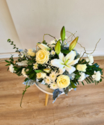 Delicate și pure, florile din acest aranjament în nuanțe de alb transmit prestanță și te ajută să-ți iei rămas bun de la cei dragi. Când cineva se stinge, vrem să-i celebrăm viața, ne bucurăm că am avut șansa să-l cunoaștem și, desigur, suferim că drumul nostru împreună se încheie aici. Florile ne ajută să transmitem toate aceste gânduri și trăiri.