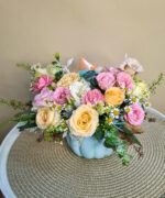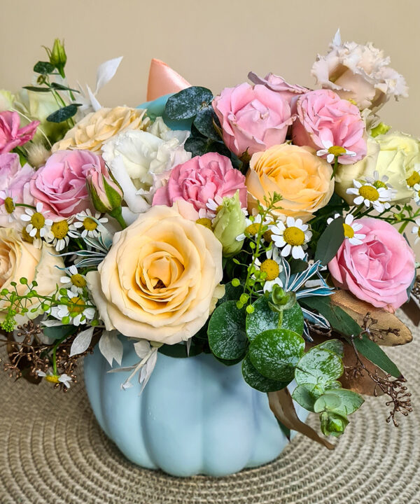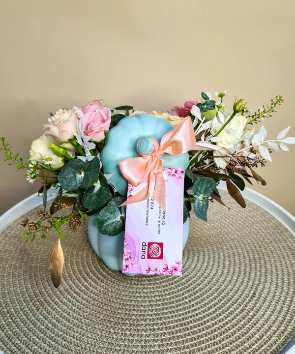 Un cadou excelent în perioada de toamnă sau de ce nu de ziua ei. Dar, la fel de bine, ai putea să-i trimiți acest aranjament acasă într-o zi în care nu sărbătoriți nimic. Bostanul ceramic turcoaz cu flori este plin de viață și culoare.