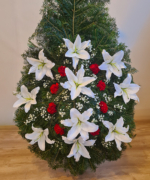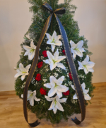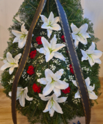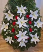 Puritatea și noblețea crinilor este completată de garoafele roșii, împreună fiind menite să transmită sentimentele de bun rămas. Această coroană este o alegerea potrivită atunci când cauți ceva deosebit și pur prin care să transmiți un ultim omagiu pentru cineva drag.
