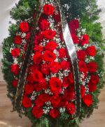 40 garoafe roșii Olanda, 24 trandafiri roșii, 8 fire Gypsophilla, cadru natural brad, panglică funerară.