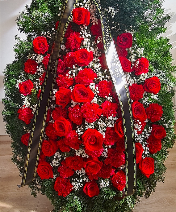 Transmite condoleanțele tale cele mai sincere, printr-o coroană funerară bogată cu garoafe și trandafiri roșii.