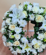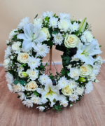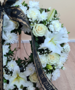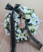 Burete sub formă de coroniță rotundă 40 cm, 1 tija Crin imperial în diferite stadii de înflorire, 6 trandafiri albi, 16 garoafe albe, 5 crizanteme albe, Gypsophilla, verdeață asortată, panglică funerară neagră.