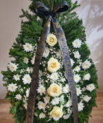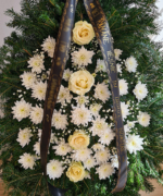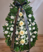 Coroana funerară cu trandafiri albi și crizantemă este elegantă, cu multe flori și transmite fără a fi nevoie de prea multe cuvinte cele mai sincere condoleanțe.