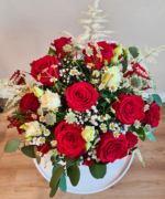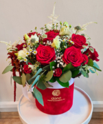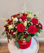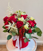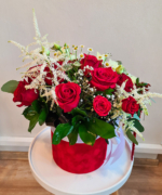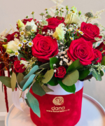 Dacă ești în căutarea unui cadou pentru jumătatea ta, noi îți recomandăm un superb aranjament într-o cutie de catifea rotundă.