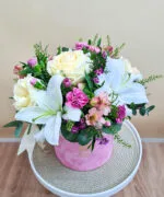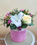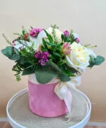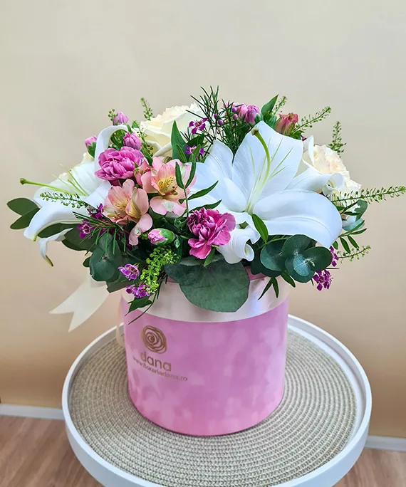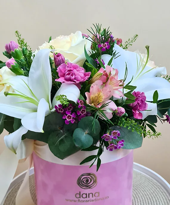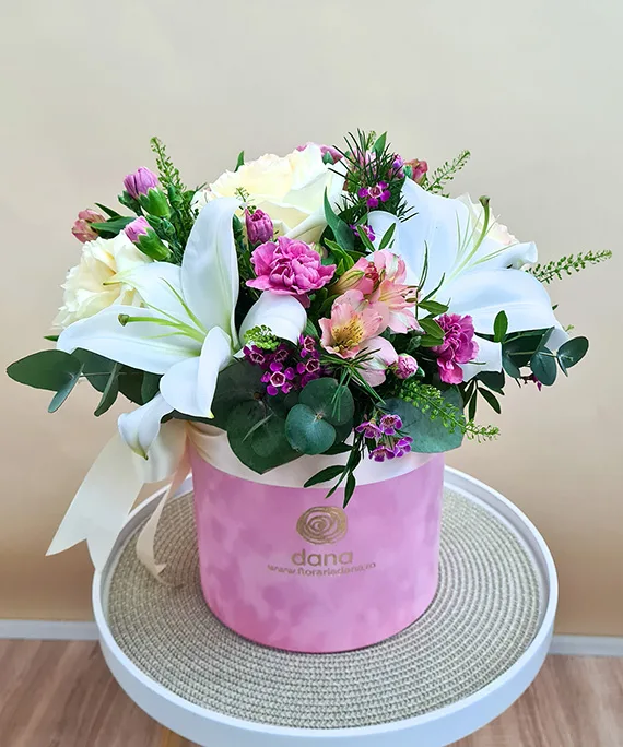Cutie catifea roz mare, 1 tija Crin imperial alb, 3 trandafiri crem, 3 Astroemeria roz, 3 garofițe color mix, 1 Chamaelaucium, verdeață asortată.
